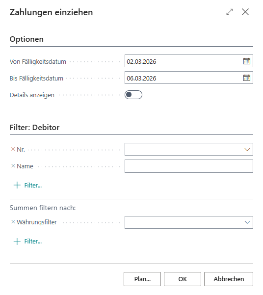 - Setzen Sie Filter (z. B. Fälligkeitsdatum, Debitor, Zahlungsformcode).