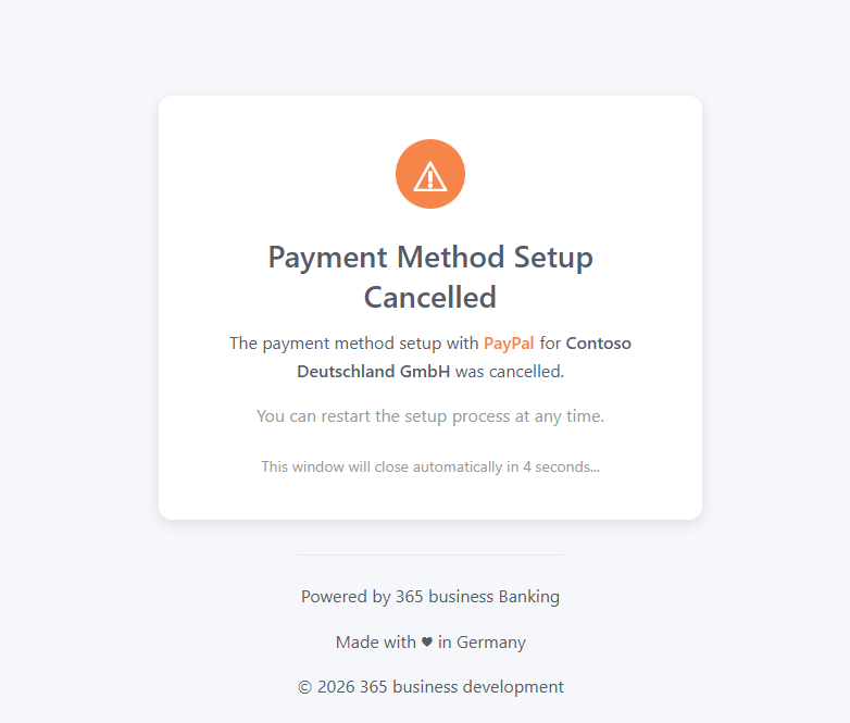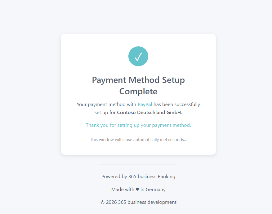 Payment authorization is triggered via Request Payment Authorization... on the customer bank account. PayPal can use optional custom redirect URLs for success and error. If no custom URLs are defined, the default 365 business Banking pages are used.